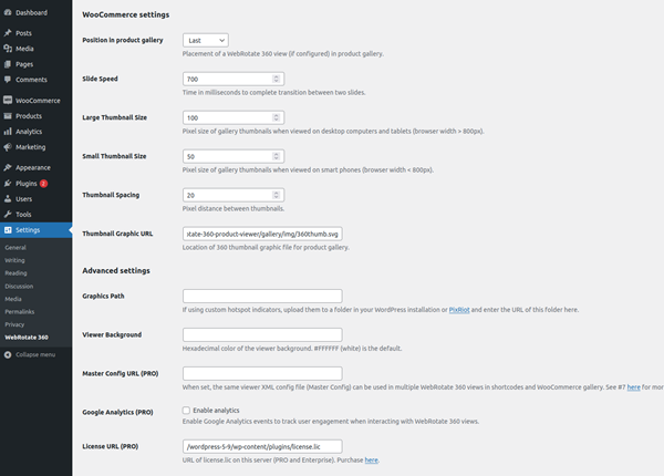 WooCommerce integration will use some of the plugin defaults located on the WebRotate 360 settings page. Please refer to the field descriptions on the settings page as well as the plugin Installation instructions above for more details.