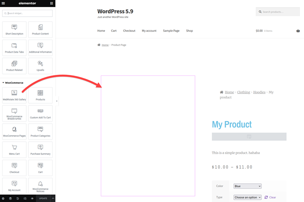 When using Elementor's Theme Builder for product pages in WooCommerce (via Single Product template), you will need to replace the default Product Images widget with the WebRotate 360 Gallery widget located under WooCommerce in the widget panel: